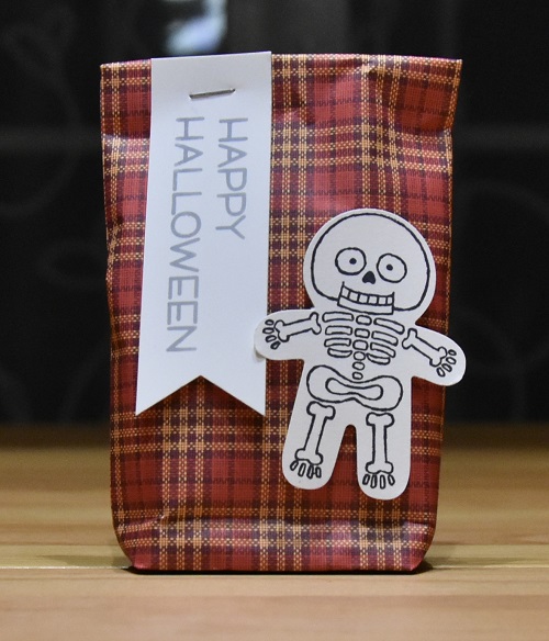 Das erste Tütchen war noch ganz einfach gehalten. Kleines Fähnchen und ein Skelett aus dem Cookie Cutter Halloween Set von Stampin' up!